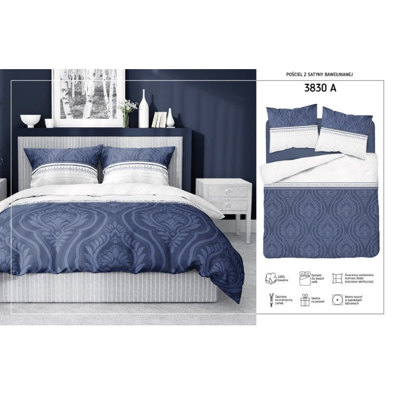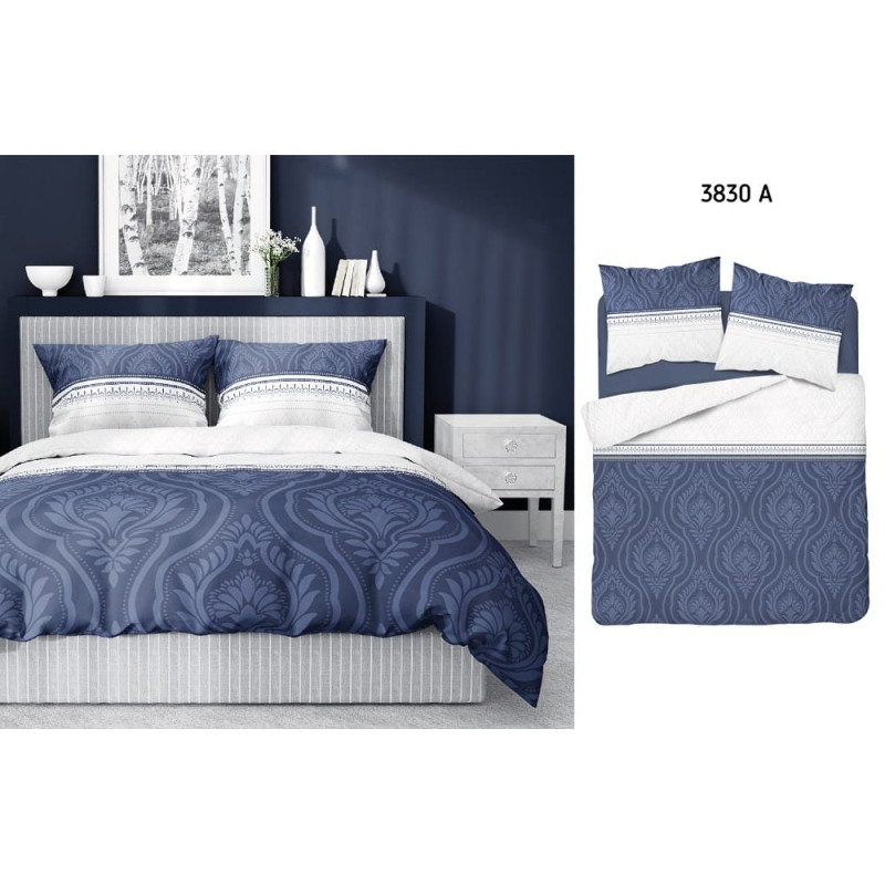 Jūsu iepirkumu grozs ir tukšs! Satīna gultasveļa 140x200 tumši zila balta sudraba rotājumi ziedu svītras 3830 A Home Satin 77