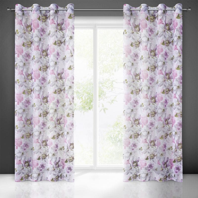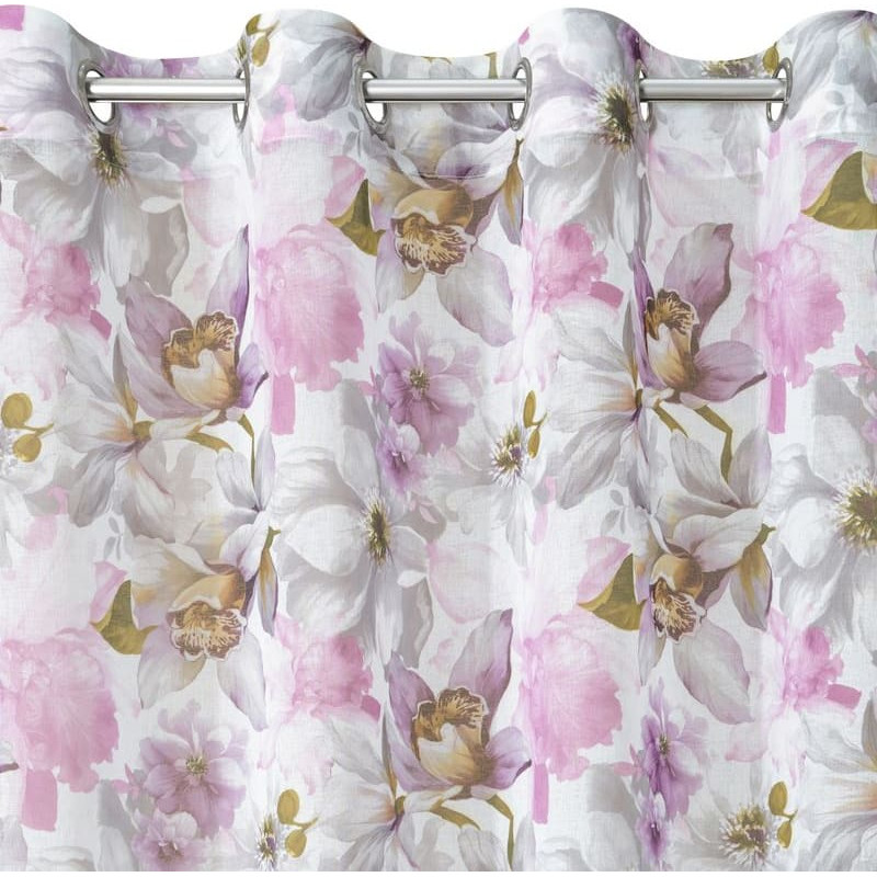 Jūsu iepirkumu grozs ir tukšs! Aizkars 140x250 Bella balts rozā izgatavots no gaiša marle, dekorēts ar ziedu apdruku, kas gatavs uz starplikām