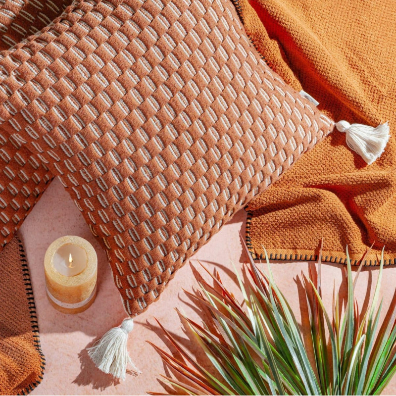 Jūsu iepirkumu grozs ir tukšs! Dekoratīvā spilvendrāna 60x60 Morocco 5 C ķieģeļu sarkana dekorēta ar Terra Collection pomponiem