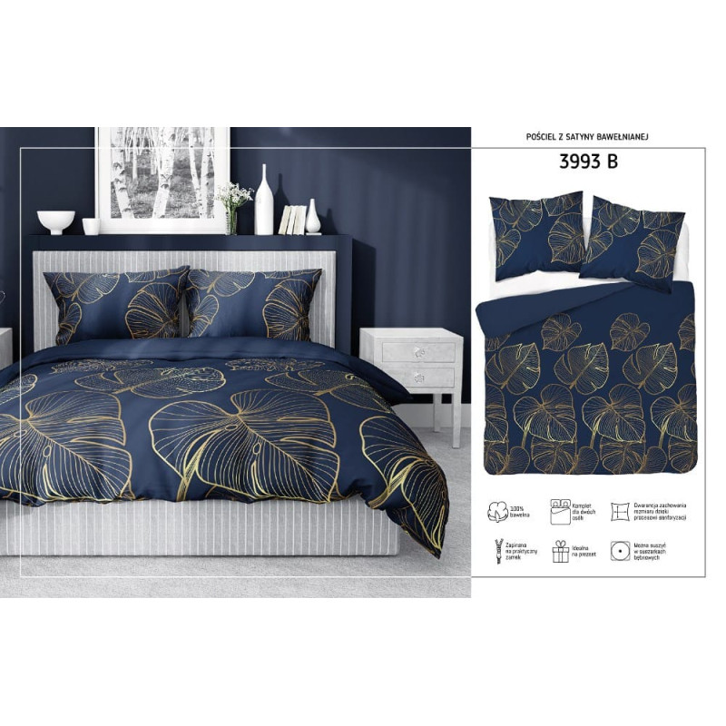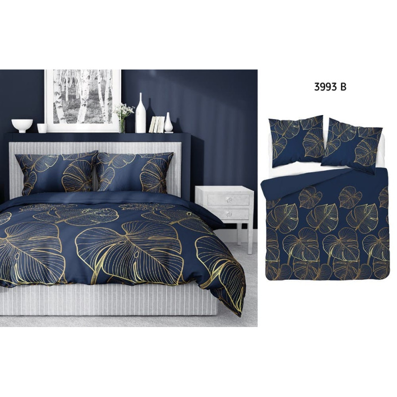 Jūsu iepirkumu grozs ir tukšs! Satīna gultas veļa 140x200 3993 B tumši zilas zelta lapas ar vienu spilvendrānu Home Satin 78