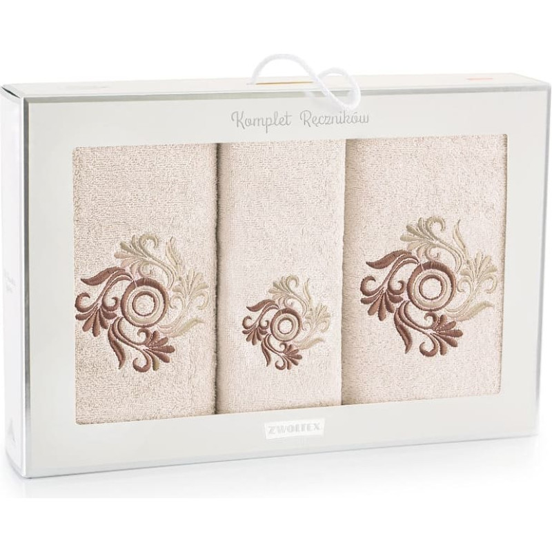 Jūsu iepirkumu grozs ir tukšs! Dvieļu komplekts kastītē 3 gab Flores Kreta-5901 dvieļi 30x50 50x100 70x140