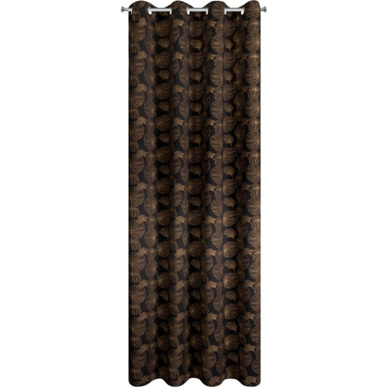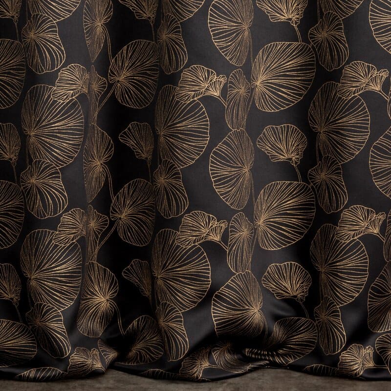 Jūsu iepirkumu grozs ir tukšs! Aizkars 140x250 Kliņģerīte gatava ar aptumšošanas auduma starplikām ar zelta ūdensrozes lapu apdruku
