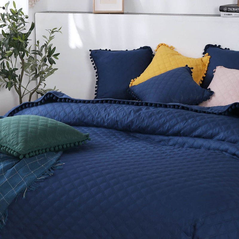 Jūsu iepirkumu grozs ir tukšs! Gultas pārklājs ar pomponiem 160x220 tumši zils Pompoo dekoratīvs rombs