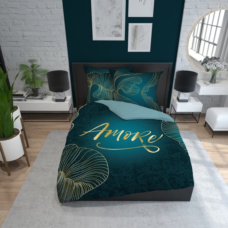 Jūsu iepirkumu grozs ir tukšs! Kokvilnas gultas veļa 160x200 Amore tirkīza zelta lapas 4327 A Holland 29