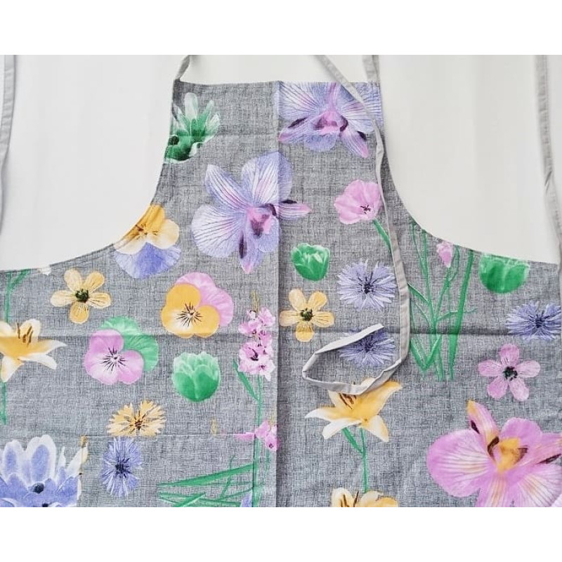 Jūsu iepirkumu grozs ir tukšs! Kokvilnas virtuves priekšauts 75x62 135A pelēks ar krāsainiem ziediem