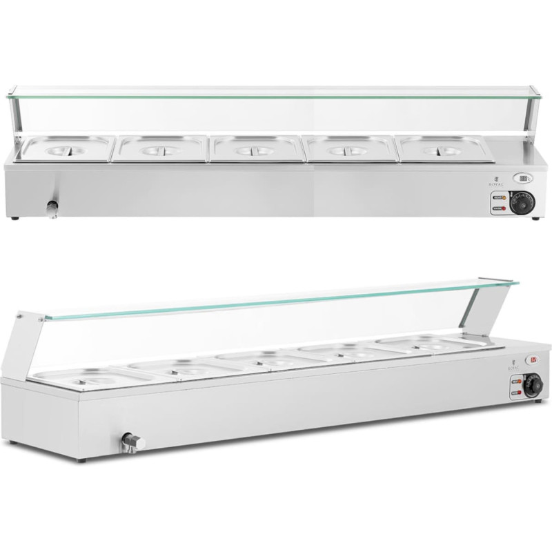 Jūsu iepirkumu grozs ir tukšs! Royal Catering Bain marie ēdiena sildītājs sildīšanas bufete ar vāku 5 x GN 1/2 2000 W