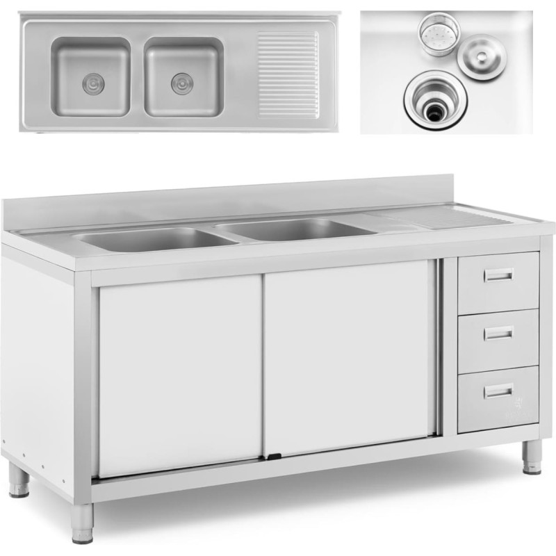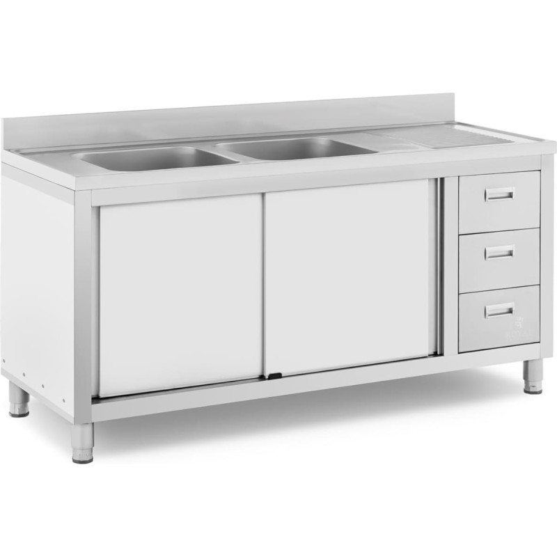 Jūsu iepirkumu grozs ir tukšs! Royal Catering Divkameru gastronomiskā baseina izlietne ar skapi ar bīdāmām durvīm un atvilktnēm, tērauds 160 x 60 x 95 cm