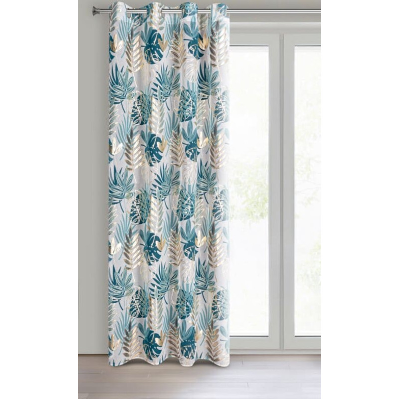 Jūsu iepirkumu grozs ir tukšs! Aizkars 140x250 Keri tirkīza zelta ar spīdīgu botānisku apdruku, gatavs ar cilpām