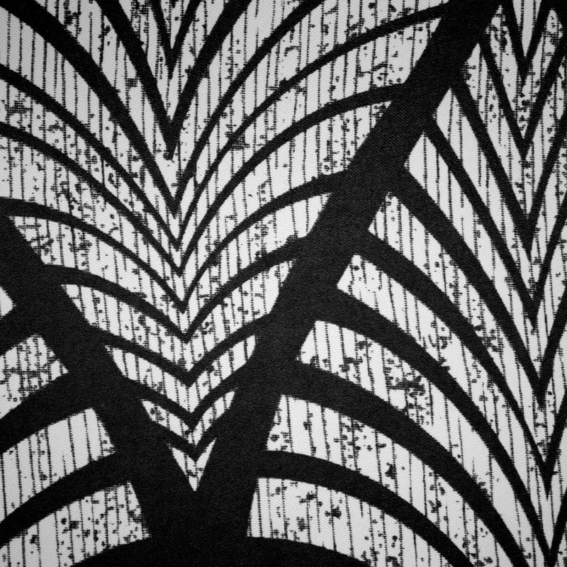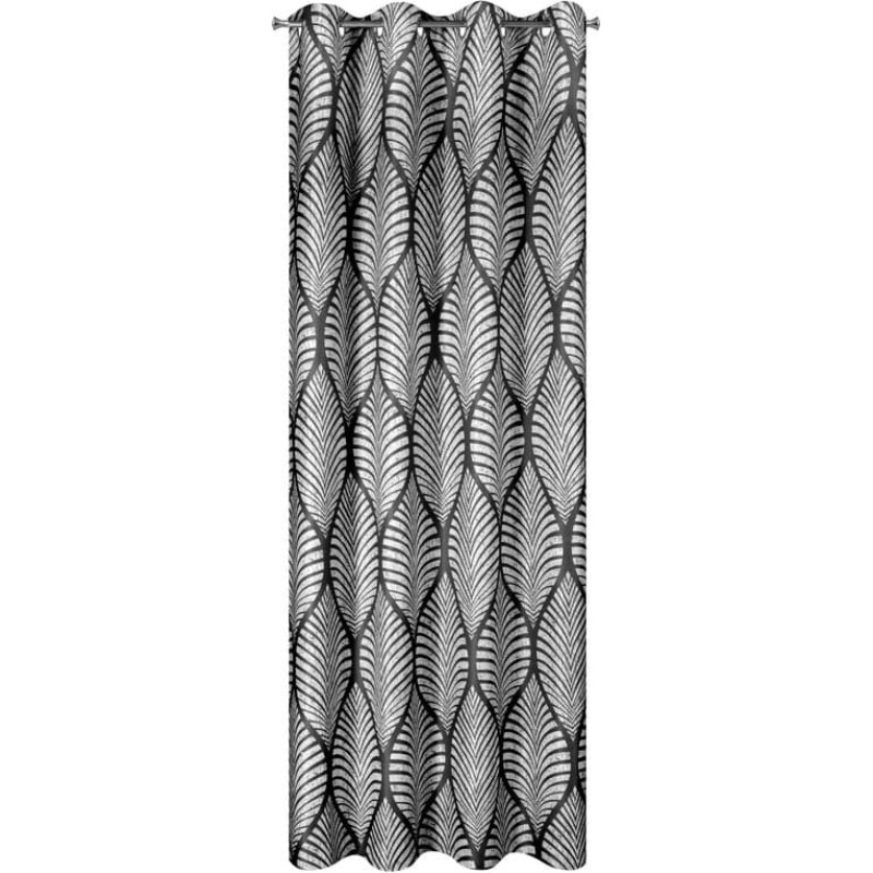 Jūsu iepirkumu grozs ir tukšs! Aizkars 140x250 Eloisa balts ar melnām lapām, gatavs ar E11 starplikām