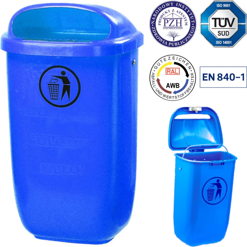 Jūsu iepirkumu grozs ir tukšs! Europlast Austria Ielu tvertne, pilsētas atkritumu konteiners, montējams uz staba vai sienas, DIN 50L - zils
