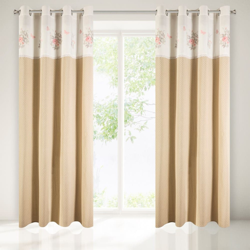 Jūsu iepirkumu grozs ir tukšs! Gatavs aizkars ar cilpām 140x250 Estel bēšs krēmkrāsas polka punktiņi ziedi tauriņi