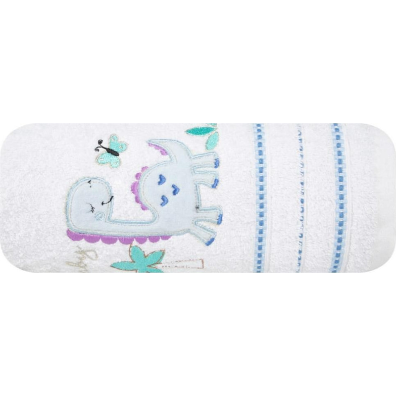 Jūsu iepirkumu grozs ir tukšs! Bērnu dvielis 75x75 Baby 29 ar kapuci balts zils dinozaurs 450g/m2