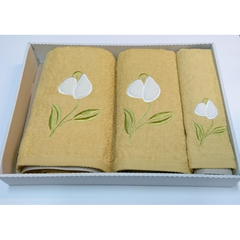 Jūsu iepirkumu grozs ir tukšs! Valentini dvieļu komplekts, 3gb, gaiši dzeltens ar izšuvumu, baltas tulpes, 30x50, 50x100, 70x140