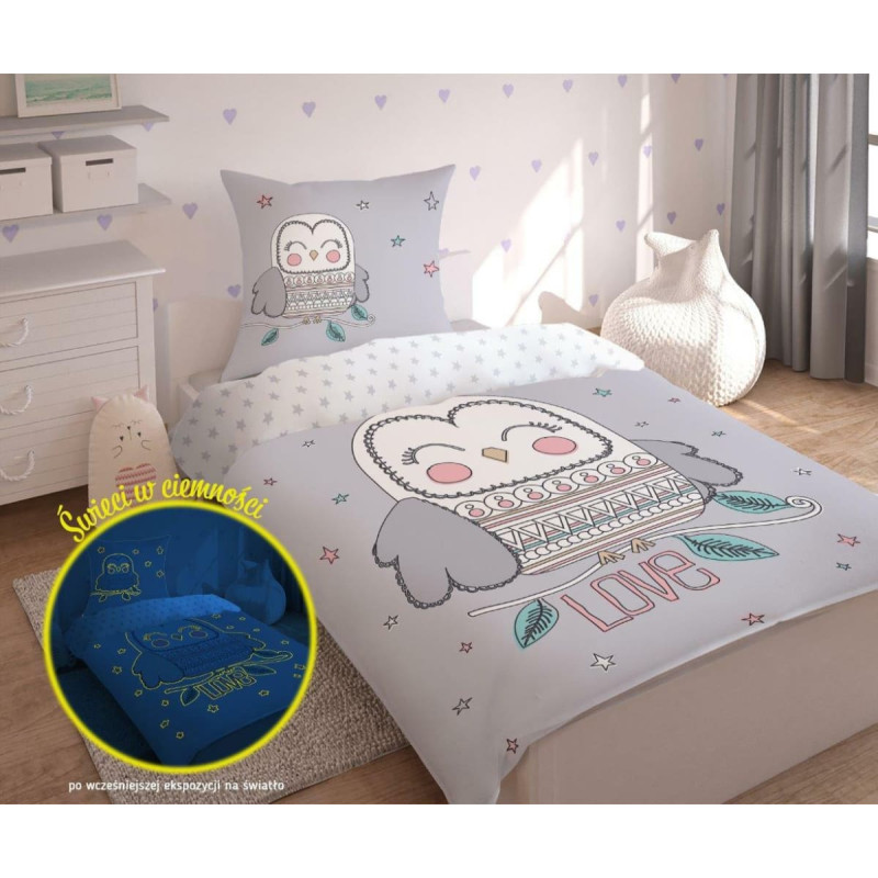 Jūsu iepirkumu grozs ir tukšs! Mirdz tumsā gultasveļa 140x200 Pūce Mīlestības pūces pelēkas baltas zvaigznes 3016 B 2346