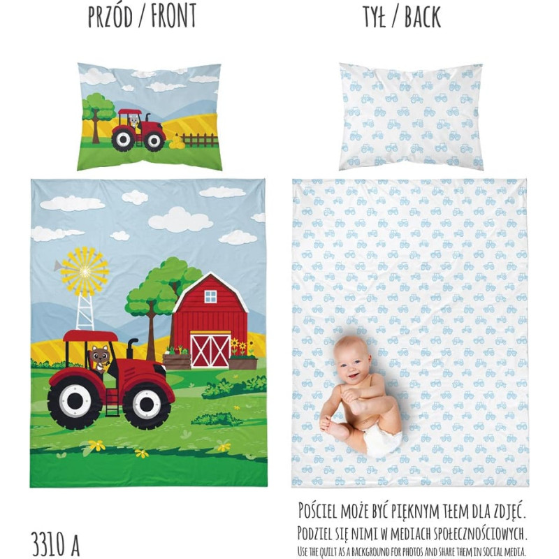Jūsu iepirkumu grozs ir tukšs! Kokvilnas gultas veļa 90x120 Traktor sarkana Farma 3310 A bērnu gultai 6160 spilvendrāna 40x60
