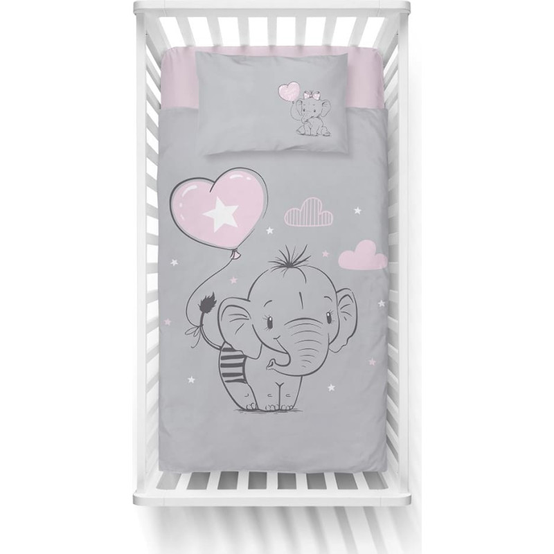 Jūsu iepirkumu grozs ir tukšs! Kokvilnas gultas veļa 100x135 Słonik 2930 Pelēks rozā Lulumi balons sirds zvaigznītes gultiņai bērnu spilvendrāna 40x60