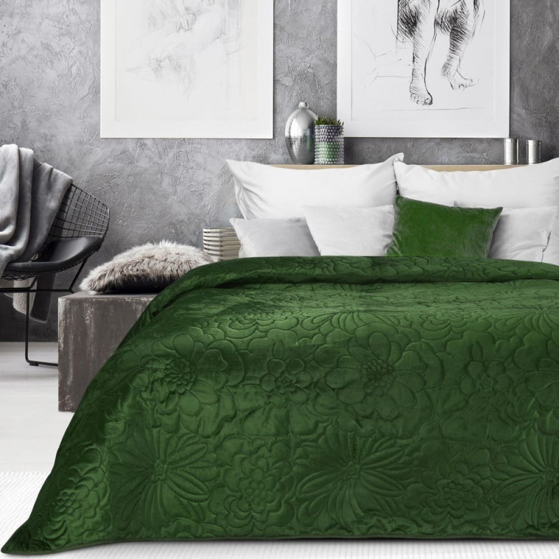 Jūsu iepirkumu grozs ir tukšs! Dekoratīvais gultas pārklājs 200x220 Ariel 4 tumši zaļš ar ziediem, samts