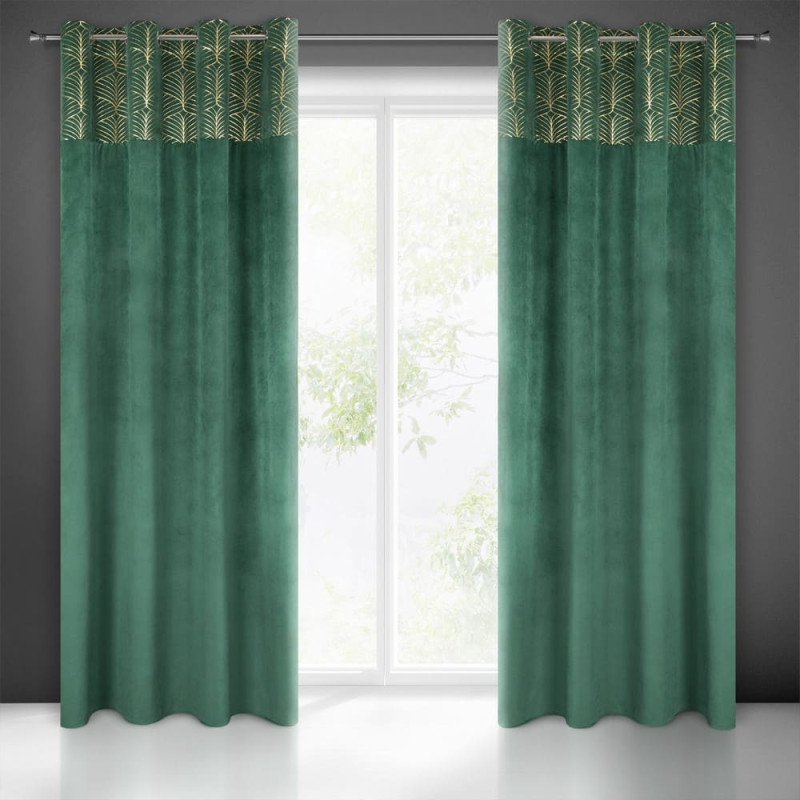 Jūsu iepirkumu grozs ir tukšs! Aizkars 140x250 Lindi zaļš zelts ar ģeometrisku apdruku, velūrs gatavs ar cilpām