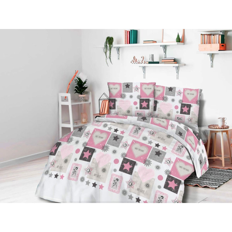 Jūsu iepirkumu grozs ir tukšs! Flaneļa gultas veļa 180x200 Ziemassvētki 31482/2 pelēkas rozā baltas sirdis zvaigznes sniegpārslas