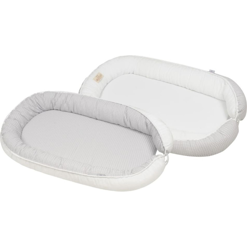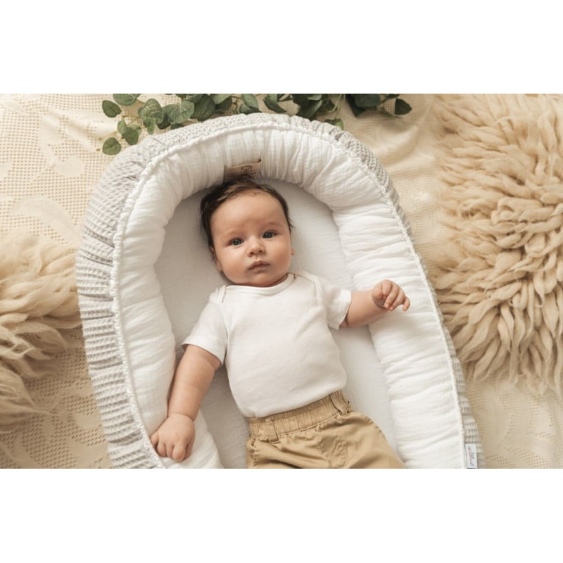 Jūsu iepirkumu grozs ir tukšs! Prestige Muslin mazuļu ligzda 55x80 balts pelēks abpusējs pārvalks