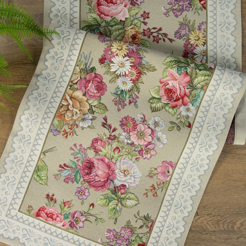 Jūsu iepirkumu grozs ir tukšs! Galda celiņš 40x100 gobelēns olīvu ziedu rozes