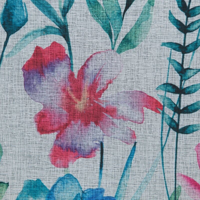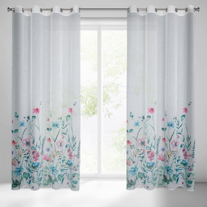 Jūsu iepirkumu grozs ir tukšs! Aizkars 140x250 Lilian balts zils no daļēji caurspīdīga etamīna ar otu krāsotu ziedu apdruku, gatavs uz starplikām