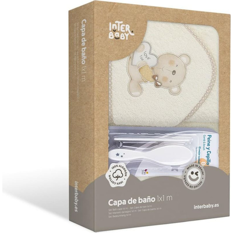 Jūsu iepirkumu grozs ir tukšs! Interbaby Vannas dvielis 100x100 Love you + zobu birste un ķemmes bēšs dvielis ar kapuci
