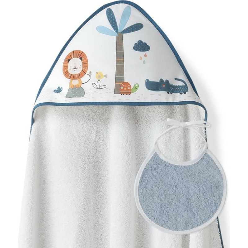 Jūsu iepirkumu grozs ir tukšs! Interbaby Vannas dvielis 100x100 Lion 2 balts zils dvielis ar kapuci + priekšautiņš