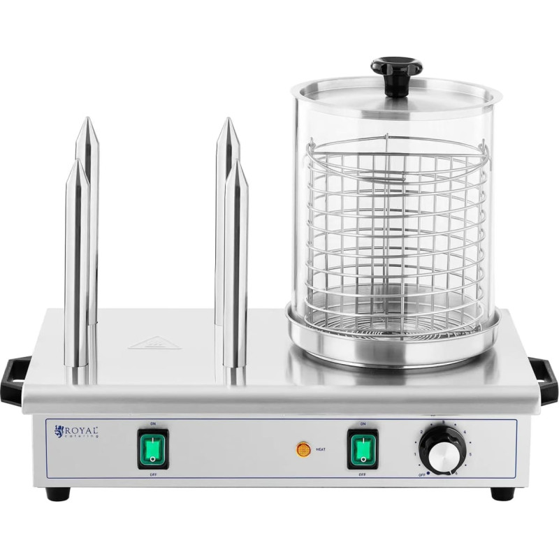 Jūsu iepirkumu grozs ir tukšs! Royal Catering Hotdogu sildītājs, 4 bulciņu iesmi, trauks 30 desām, 650 W