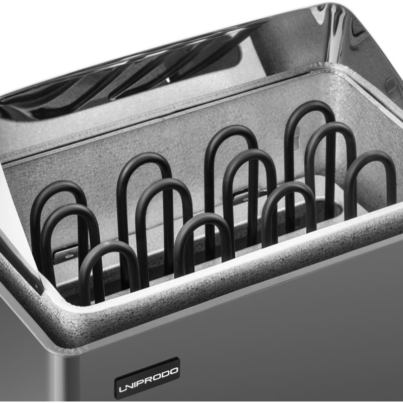 Jūsu iepirkumu grozs ir tukšs! Uniprodo Elektriskā pirts krāsns 5-9 m3 līdz 110C 400 V 6 kW melns un sudrabs