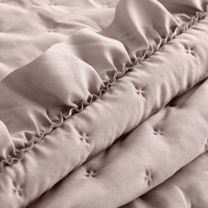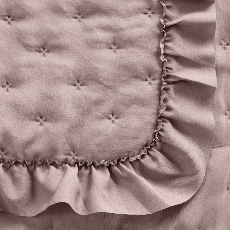 Jūsu iepirkumu grozs ir tukšs! Dekoratīvs gultas pārklājs 220x240 Libi 3 pūderrozā ar apdari un volāniem