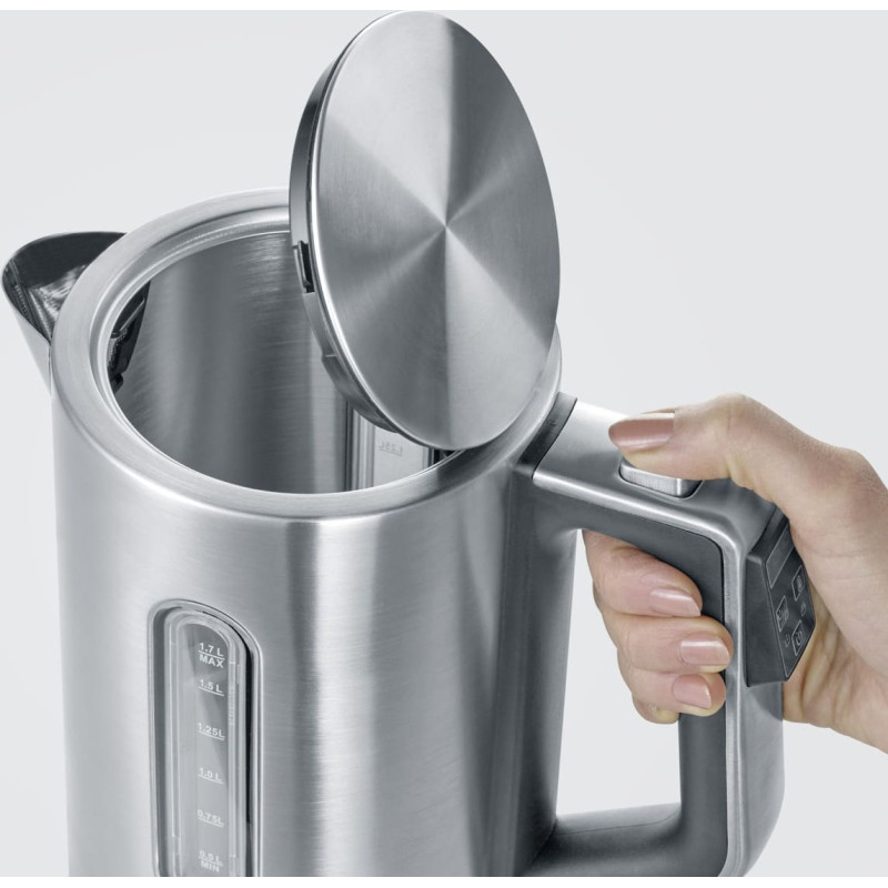 individuāla temperatūras izvēle starp 40 ° un 100 ° C - regulējama 5 ° C pakāpēs Ātri vārāma-jauda līdz 30% ātrāka vārīšanās 100% bez BPA dabīgai un pilnīgi veselīgai ēdiena baudīšanai augstas kvalitātes nerūsējošā tērauda dizains ar 1,7 L XXL ietilpību ar siltuma uzturēšanas funkciju perfektai temperatūras uzglabāšanai patīkama vadīšana ar vienu roku, pateicoties ērti izveidotajam rokturim saliekams vāks ar XXL atveri, nerūsējošā tērauda dibenu un slēptu sildelementu ērtai tīrīšanai 360 ° centrālā bezvadu sistēma: to var piestiprināt pie ierīces pamatnes no jebkura virziena Ūdens līmeņa displejs sarkanā / zilā krāsā, kas apgaismots no abām pusēm ērtai lietošanai, vienlīdz piemērots labās un kreisās rokas cilvēkiem aizsardzība pret sausu vārīšanu izliešanas snīpis tvaika atslēgšana slēpts sildelements kabeļa garums: 750 mm neto svars: 1114 g bruto svars: 1481 g izstrādājuma izmēri (augstums): 235 mm izstrādājuma izmēri (platums): 145 mm izstrādājuma izmēri (garums): 240 mm iepakojuma izmēri (augstums): 252 mm iepakojuma izmēri (platums): 170 mm iepakojuma izmēri (garums): 230 mm