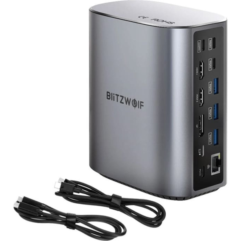 Blitzwolf BW-TH15 17in1 Docking Station 2xHD+DP+4xC+3xUSB 3.0+USB 3.1+C 3.2+C PD+RJ45+micro SD+SD+3.5mm AudioThe Blitzwolf BW-TH15 docking station is an advanced solution for those who need the maximum number of ports in one place. Equipped with as many as 17 different interfaces, it allows you to connect multiple devices at the same time, providing convenience and saving space on your desk. There are 2 HDMI ports, 1 DisplayPort, 4 USB-C ports, 3 USB 3.0 ports, 1 USB 3.1 port and USB-C 3.2 Gen2 for the host, ensuring wide compatibility and fast data transfer.