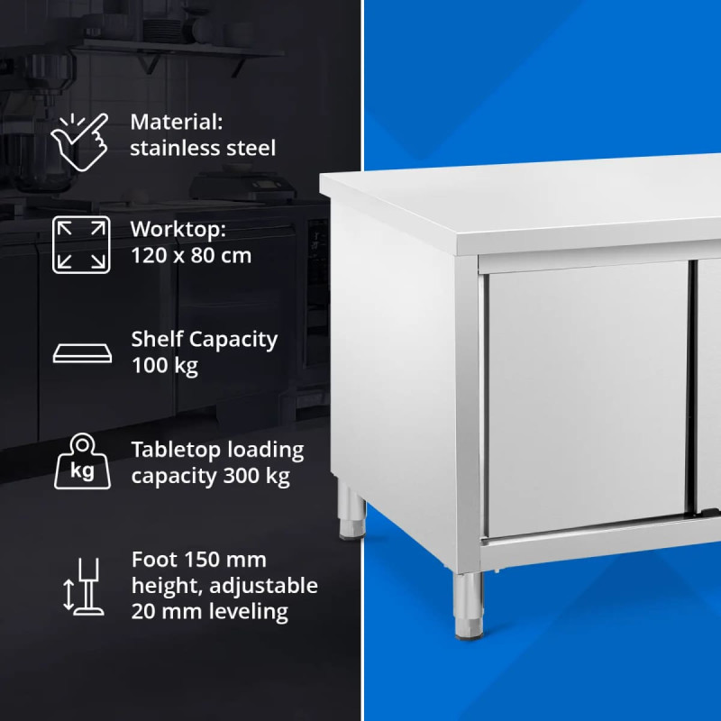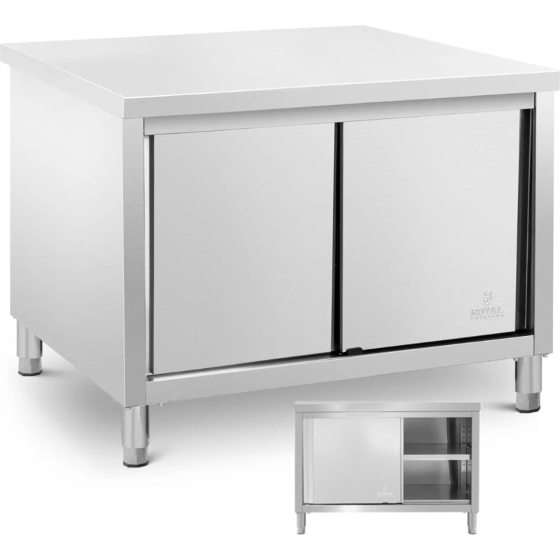 Jūsu iepirkumu grozs ir tukšs! Royal Catering Galds, centrālā darba virsma ar skapi, bīdāmās durvis, ECO STEEL, 120 x 80 cm