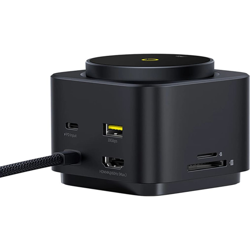 | Baseus MagPro Series II 7-in-1 USB-C Hub with MagSafe-compatible Charger 15W + HDMI + USB-A + USB-C + SD/TF - Black The Baseus MagPro Series II is a versatile 7-in-1 USB-C hub with 15W fast wireless charging and MagSafe compatibility, providing powerful port expansion and complete convenience. Compact as a Rubik's Cube, it packs a powerful punch: HDMI 4K@60Hz, USB-C and USB-A 3.2 (10Gbps), SD/TF card slots, 100W Power Delivery charging, and an innovative one-click screen-off feature. Equipped with a non-slip base, an efficient cooling system, and 10N magnetic mounting, it's the perfect desk companion for any iPhone or laptop with a USB-C port. The MagPro Series II enables fast data transfer, multiple device connections, and safe chargingâall in one ultra-compact accessory. ~ Specification: - Brand: Baseus