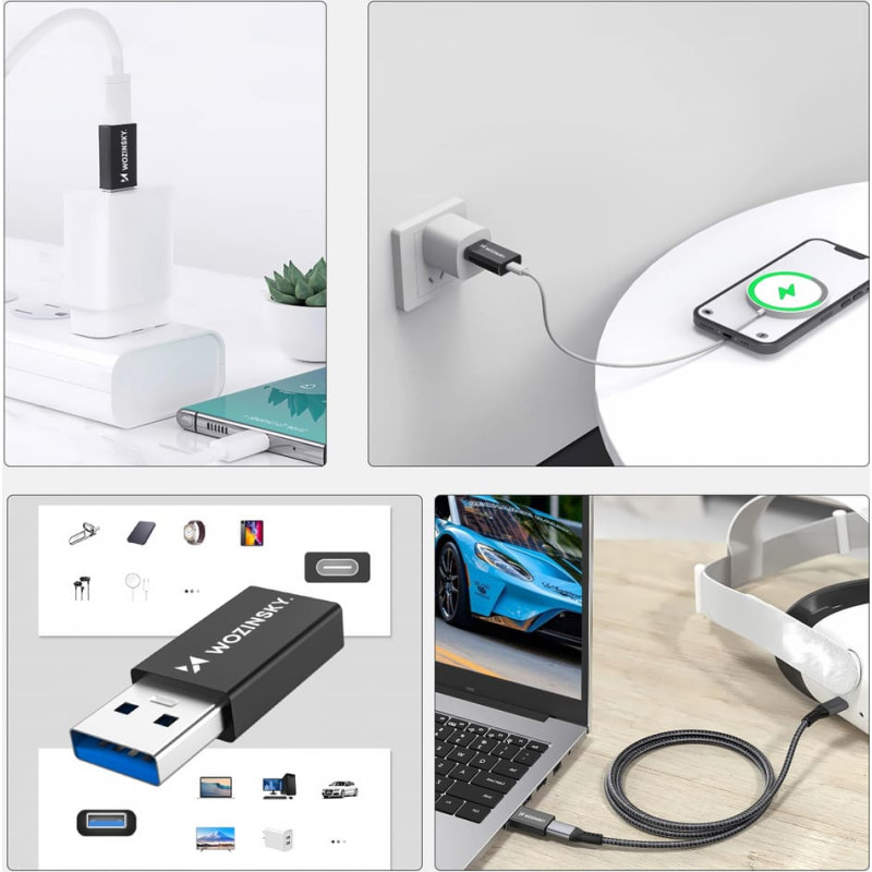 | Wozinsky WAAC-01 USB-A - USB-C OTG Adapter - Black The Wozinsky WAAC-01 adapter is a practical solution that allows you to easily convert a USB-A port to USB-C. It allows you to quickly connect your smartphone, tablet, external drive, or flash drive to a computer or other device with a USB-A port. It supports fast data transfer at up to 10 Gb/s and charging at up to 3 A, ensuring convenience and saving time. A built-in 56 kΩ resistor ensures safe operation, while a high-quality AW3410 chip ensures a stable connection. Made of lightweight aluminum, the adapter is durable, compact, and always ready for plug-and-play operation. ~ Specification: