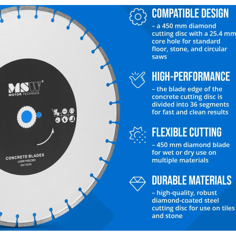 Jūsu iepirkumu grozs ir tukšs! MSW Dimanta disks betonam, keramikai, flīzēm, diametrs 450 mm, urbums 25,4 mm