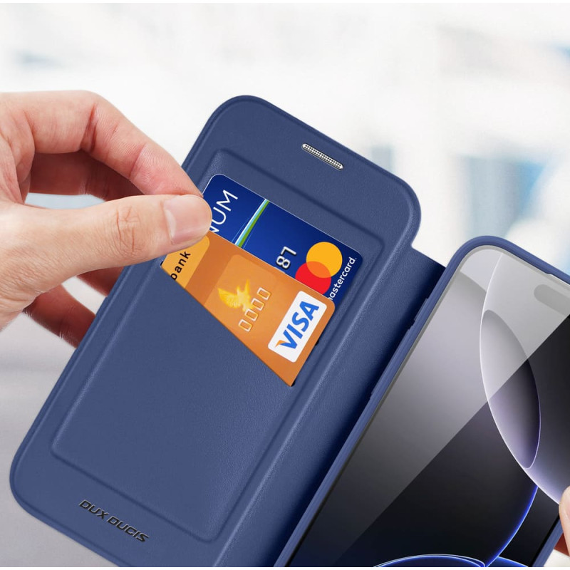 | Dux Ducis Skin X Pro iPhone 17 Pro Case with Wallet, MagSafe Compatible - Blue Stand out with elegance and choose proven protection â the Dux Ducis Skin X Pro case for iPhone 17 Pro in blue combines style, functionality, and security. Thanks to its wallet function and RFID blocking technology, you can always keep your most important items close at hand â and protected. The case is MagSafe compatible â 38 neodymium magnets ensure a perfect fit with chargers and mounts. The slim, durable design with a magnetic closure and a soft TPU frame guarantees comfortable use and effective protection every day. Choose a case that combines modern design with practicality. ~ Specification: