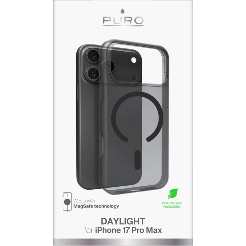 | Puro Daylight MagSafe Compatible Silicone Case for iPhone 17 Pro Max - Translucent Black The Puro Daylight case offers elegant and robust protection for your iPhone 17 Pro Max. Full MagSafe compatibility lets you charge wirelessly and charge accessories without removing the case. The semi-transparent, matte Soft Touch surface gives it a stylish look and reduces fingerprints. The flexible design makes it easy to use every day, while raised edges effectively protect the screen and camera from damage. Choose the Puro Daylight case for a combination of aesthetics and reliable phone protection. ~ Specification: