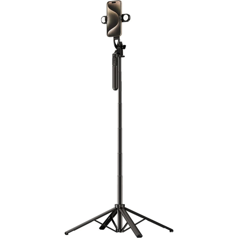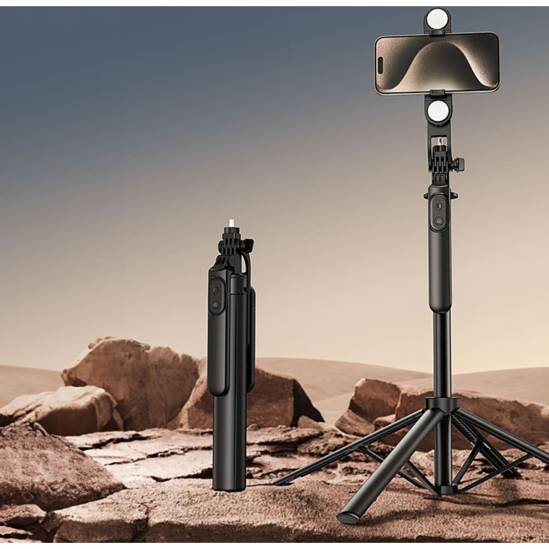 | WH181D-Y1S Telescopic Selfie Stick / Aluminum Alloy Tripod Up to 1.75m Height with Dual Lamp and Phone Holder - Black Make your vlogging world even more professional! The solid construction of the WH181D-Y1S selfie stick, made of aluminum alloy, provides unparalleled stability, and the maximum height of 1.75 m allows you to capture every moment from the perfect perspective. The set includes a dual lamp with three different color temperatures, which allows you to perfectly match the lighting to the conditions. A detachable phone holder and wide compatibility with devices are a guarantee of convenience. Remote control via Bluetooth 5.2, working on both Android and iOS, makes the operation simple and intuitive. Specification: