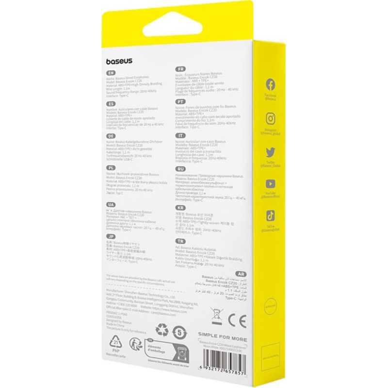~ Hi-Res Audio quality soundThe Baseus Encok CZ20 headphones support 24bit/96kHz high-resolution audio, offering clarity, depth and excellent tone separation. Wideband titanium diaphragmThe dynamic driver with titanium coating guarantees powerful bass and rich details across the full frequency range â up to 40 kHz. Ergonomic and lightweightThe slim, ear-fitting housings do not cause pressure, so you can listen to music for hours in complete comfort. Crystal HD microphoneThe built-in high-sensitivity microphone effectively eliminates noise, ensuring a natural voice during calls and video conferences. Durable braided cableThe soft, densely braided cable is resistant to bending and tangling, protecting the internal wires for long-lasting, damage-free use. |