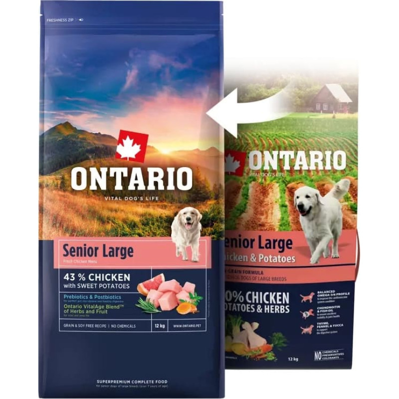 Barība suņiem – Ontario Senior Large, Chicken and Sweet Potatoes, 12 kg Pilnvērtīga super premium klases sausā barība ar vistas gaļu un saldajiem kartupeļiem lielu šķirņu suņiem senioriem. Viegli sagremojama augstas kvalitātes barība suņiem senioriem – veselīgai gremošanai un vitalitātei. Palīdz uzturēt veselīgu gremošanu, spēcīgus muskuļus un skaistu kažoku, kā arī sniedz enerģiju visai dienai. Pateicoties olbaltumvielu, B vitamīnu un niacīna saturam, tā palīdz uzturēt spēcīgus muskuļus, veselīgu ādu un kažoku. Saldie kartupeļi ir lielisks šķiedrvielu un enerģijas avots, kas palīdz uzturēt stabilu cukura līmeni asinīs un veselīgu gremošanu. Sastāvs Svaiga vistas gaļa (26 %), dehidrēts vistas gaļas proteīns (17,5 %), saldie kartupeļi (15 %), sarkanās lēcas (10 %), kartupeļu ciete (7 %), dehidrēts tītara gaļas proteīns (5 %), žāvēts biešu mīkstums (3,5 %), mājputnu tauki (konservēti ar dabīgiem tokoferoliem) (3 %), hidrolizētas aknas (2,5 %), raugs, žāvēta cigoriņu sakne (2 %), linsēklas (1 %), minerālvielas, lašu eļļa (0,5 %), jukas ekstrakts (0,5 %), holīna hlorīds (0,2 %), žāvētu garšaugu un augu ekstraktu maisījums 0,15 % (0,1 % žāvēts timiāns, rozmarīns un pētersīļi, 0,05 % Ontario VitalAge Blend™ (greipfrūtu, kurkumas, krustnagliņu un rozmarīna augu ekstrakti)), mannānoligosaharīdi (ActiveMOS 0,1 %), hondroitīna sulfāts (270 mg/kg), glikozamīna sulfāts (200 mg/kg), inaktivēts probiotiķis Lacticaseibacillus paracasei HA-108 (7,5 x 10^9 šūnas/kg). Analītiskais sastāvs Olbaltumvielas 25 %, tauki 11 %, pelni 7 %, šķiedras 3,5 %, kalcijs 1,5 %, fosfors 1 %, omega-6 taukskābes 2,1 %, omega-3 taukskābes 0,4 %, mitrums 8 %. Piedevas Uzturvielu piedevas uz 1 kg: A vitamīns 18 000 SV, D3 vitamīns 1500 SV, E vitamīns 500 mg, cinks (cinka sulfāta monohidrāts) 95 mg, dzelzs (dzelzs sulfāta monohidrāts) 100 mg, mangāns (mangāna oksīds) 40 mg, varš (vara sulfāta pentahidrāts) 10 mg, jods (bezūdens kalcija jodāts) 2 mg, selēns (nātrija selenīts) 0,2 mg, hondroitīna sulfāts 270 mg, glikozamīna sulfāts 200 mg. Tehnoloģiskās piedevas: dabiskie antioksidanti (tokoferola ekstrakti).