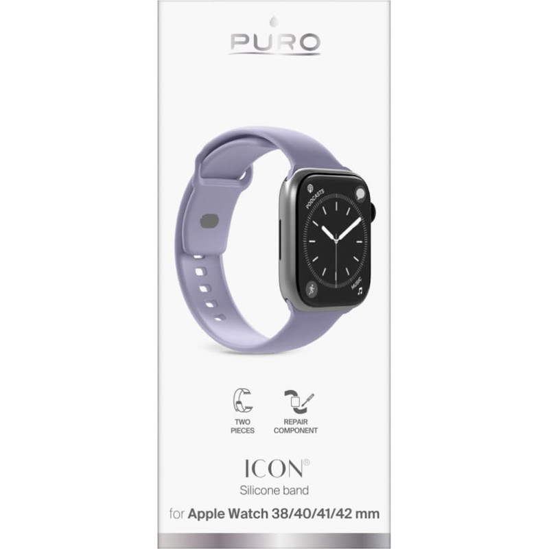 | Puro Icon Strap for Apple Watch 38/40/41/42mm - Purple The Puro Icon Band is an aesthetically pleasing and comfortable addition to the Apple Watch, designed with everyday wear in mind. Flexible silicone with a pleasant soft-touch finish conforms well to the wrist, ensuring all-day comfort. Two straps of varying lengths are included, allowing for a precise fit. The metal buckle embossed with the Puro logo underlines the accessory's refined character. This is a great option for those who want to combine watch functionality with a cohesive, modern style. ~ Specification:
