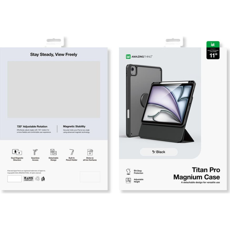 | AmazingThing Titan Pro Mag Case for iPad Air M3 11" - black The AmazingThing Titan Pro Mag Case offers advanced protection with a magnetic stand, designed specifically for the 11" iPad Air. The design combines a stable magnetic system with a wide range of device adjustments, allowing for comfortable work, drawing, and multimedia use. 720° rotation allows you to precisely adjust the iPad's position to your current needs, while the detachable design allows you to quickly switch from stand mode to a slim protective case. A built-in Apple Pencil holder enhances the set's functionality in everyday use. ~ Specification: