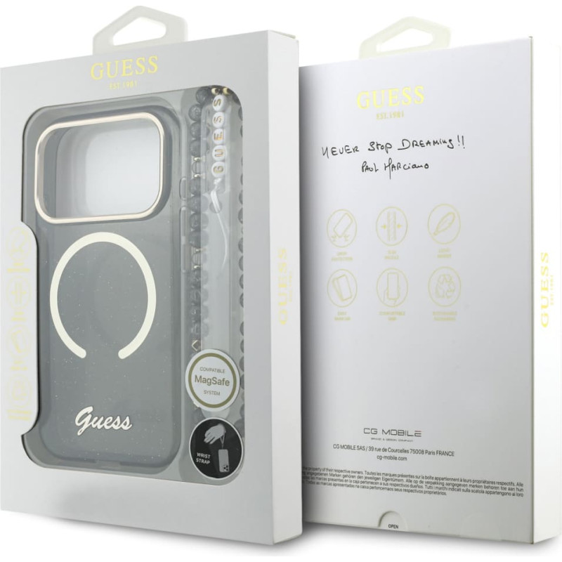 Jūsu iepirkumu grozs ir tukšs! Guess IML Glitter Script Strap MagSafe Case for iPhone 17 Pro Black