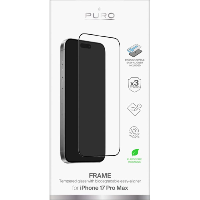 Jūsu iepirkumu grozs ir tukšs! Puro Rūdīts stikls iPhone 17 Pro Max ar aplikatoru un melnu rāmi