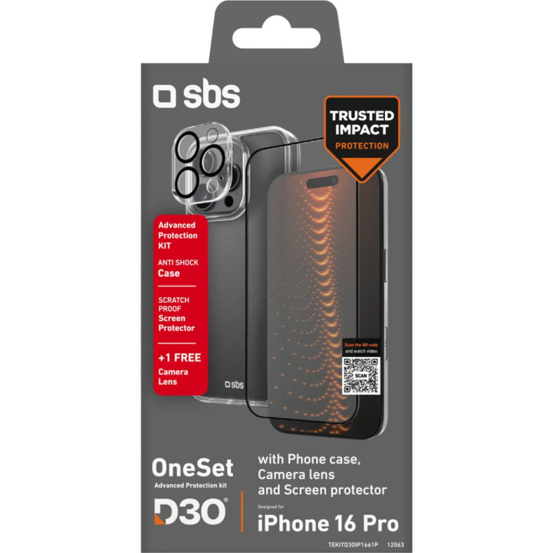 Jūsu iepirkumu grozs ir tukšs! SBS 3-in-1 iPhone 16 Pro aizsargvāciņš, D3O ekrāna aizsargs un kameras stikls - caurspīdīgs