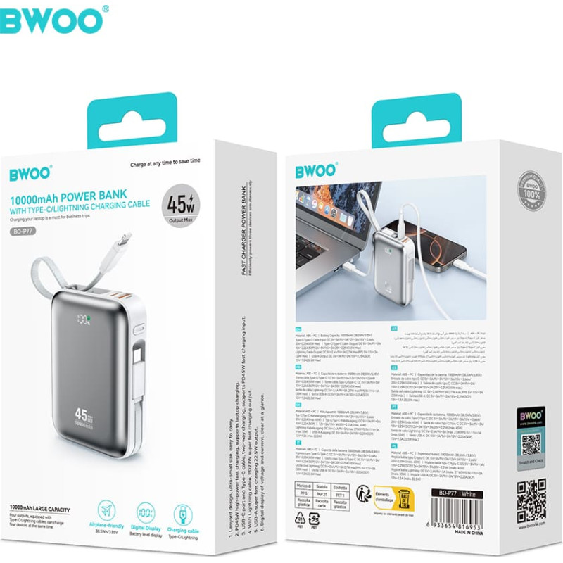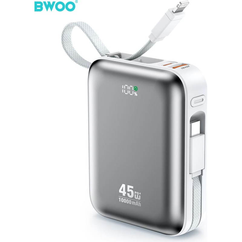 Jūsu iepirkumu grozs ir tukšs! BWOO power bank P77 45W, 10000 mAh with USB-C and Lightning cable, grey