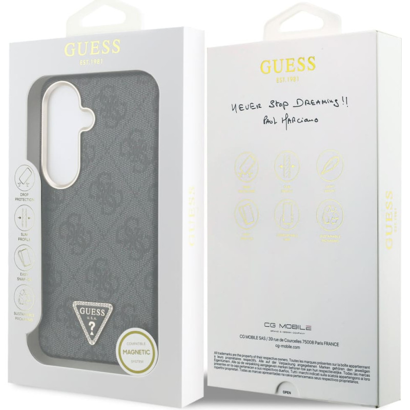 Jūsu iepirkumu grozs ir tukšs! Guess PU Leather 4G Strass Triangle Logo Gold Frame Magnetic Case for Samsung Galaxy S26 Black