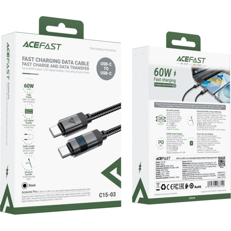 | Acefast C15-03 USB-C to USB-C with Display Cable 480Mbps 60W 1.2m - Black Choose the Acefast C15-03 cable if you care about fast charging, durability and modern parameter control. It supports charging with up to 60 W and data transmission at 480 Mb/s. The built-in LED display shows the current power in real time, which increases the comfort and safety of charging. The construction based on reinforced zinc alloy connectors and abrasion-resistant nylon braiding ensures durability confirmed by 10,000 bend tests. The perfect choice for smartphones, tablets and laptops with a USB-C port. ~ Specification: